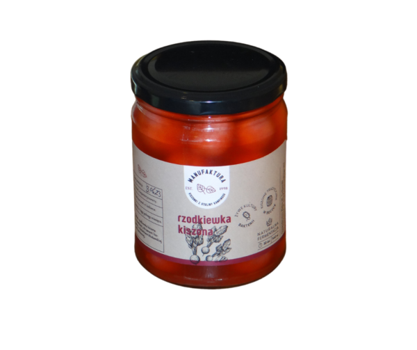 Rzodkiewki uprawiane i kiszone naturalnie z dodatkiem czosnku, kopru oraz kłodawskiej soli kamiennej.